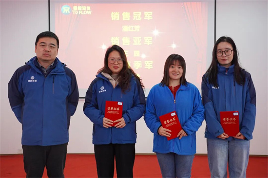 黨委書(shū)記楊凌杰為銷(xiāo)售冠軍潘紅芳、亞軍王園、季軍朱川渝頒獎(jiǎng)